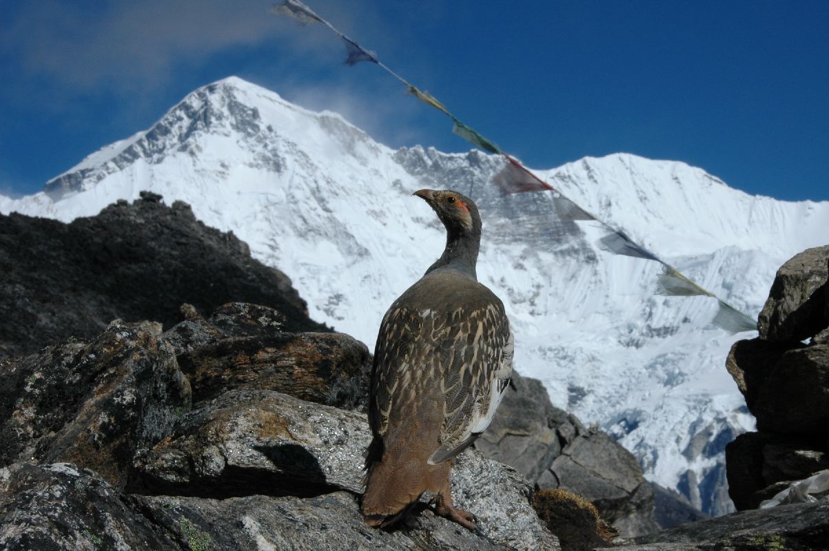 Cho Oyo in the background; with Tibetan snowcock posing for a good shot.