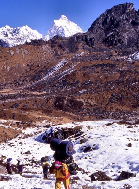 Porters on their way to Selele La meet the leftover snow that an unusual