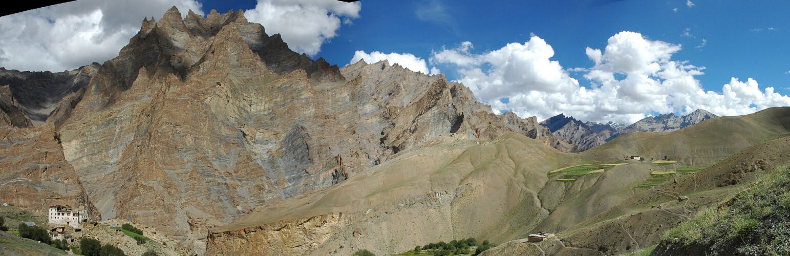 Panorama with some tents at the very left; and a little pass in the dip of the ridge at the right.