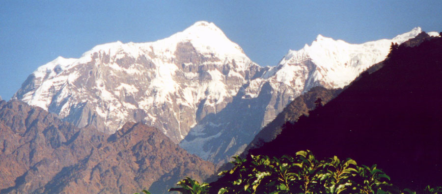 The high summits of Shringi and Ganesh rise above the yellow fields and lush